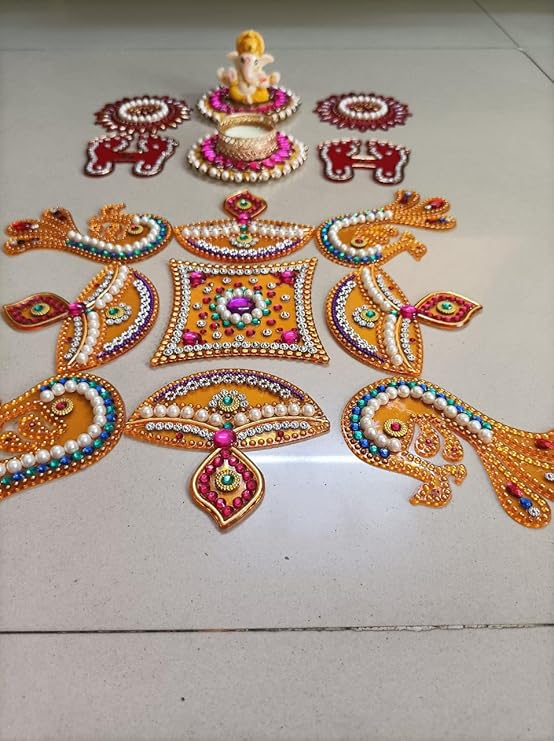 SS Craft Creations presents handmade designer decorative Acrylic Rangoli, crafted with precious stones and Kundans. Beautiful handmade Acrylic Rangoli with creative design and Kundan work to decorate your home entrance beautifully. You can make multiple varieties of Rangoli designs different for every occasion. It’s a must for your Puja room, party and festive decorations like Ganesh Puja, Navratri, Dassera, Diwali etc. Just place this beautiful Rangoli on your floor and beautify your home. No need to fix it to the floor with glue or stickers. Just place it on the ground/floor and a gorgeous kolam/ Rangoli is ready to decorate your auspicious Puja room and will look absolutely stunning at your house during functions. This Rangoli can also be pasted on the wall to decorate your living room walls.